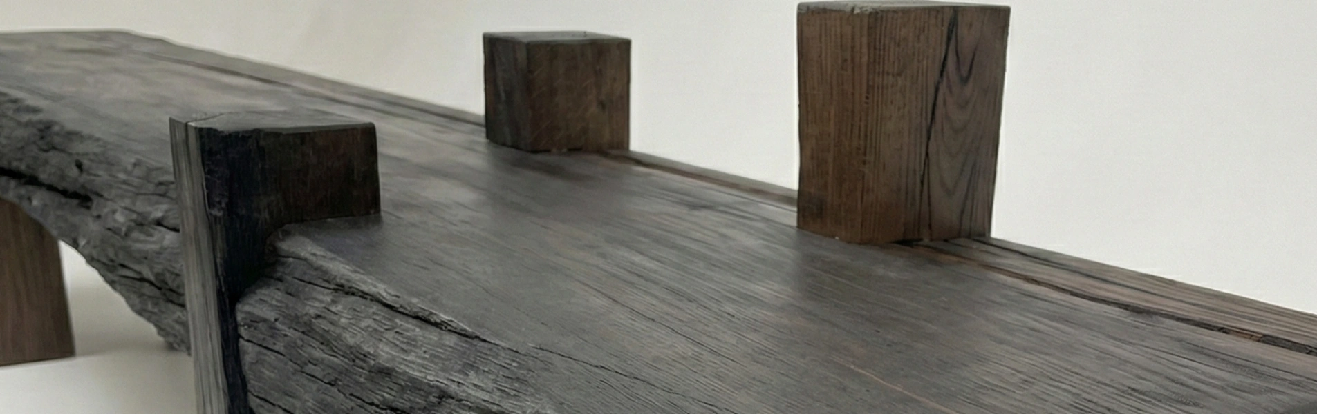 Ława w stylu brutalistycznym wykonana z datowanego na 2 tysiące lat czarnego dębu - z naturalnym oflisem.