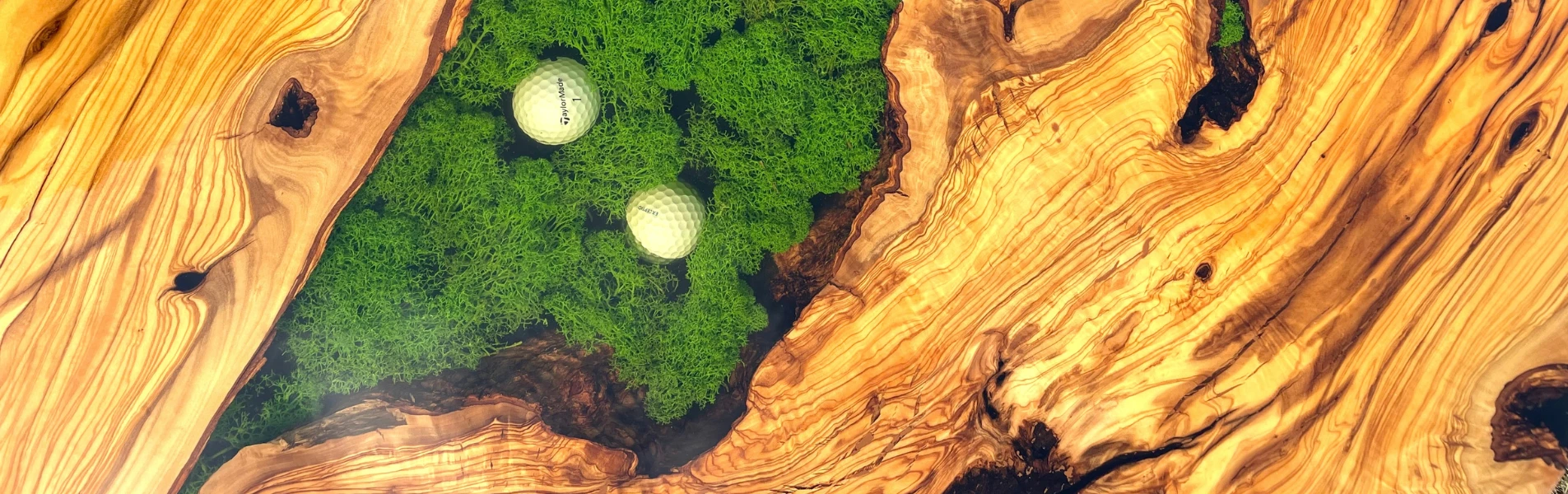 Okrągły stół jadalniany wykonany z desek drewna oliwnego w połączeniu z żywicą epoksydową, w której zatopione zostały piłeczki golfowe na mchu chrobotku