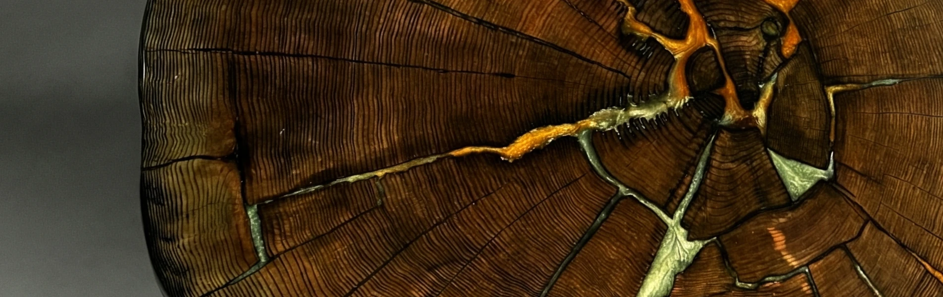 Stół jadalniany z opalonego plastra jesionu z perłową żywicą - pomarańczową i srebrną.