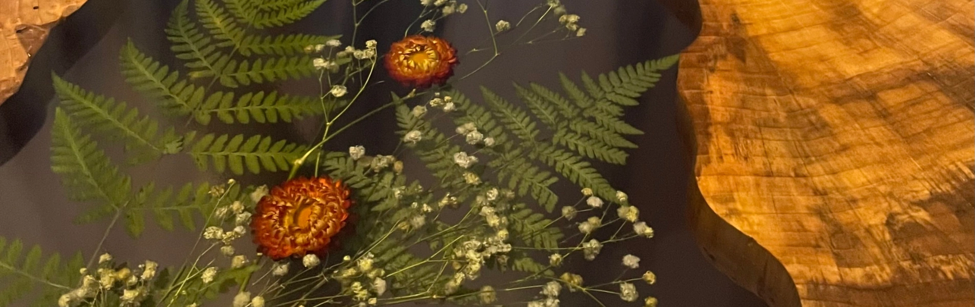 Stół jadalniany w obłym kształcie wykonany z plastra topoli z dużym uzupełnieniem żywicznym, w którym zatopione są paprotki, suchotniki oraz gipsówka.