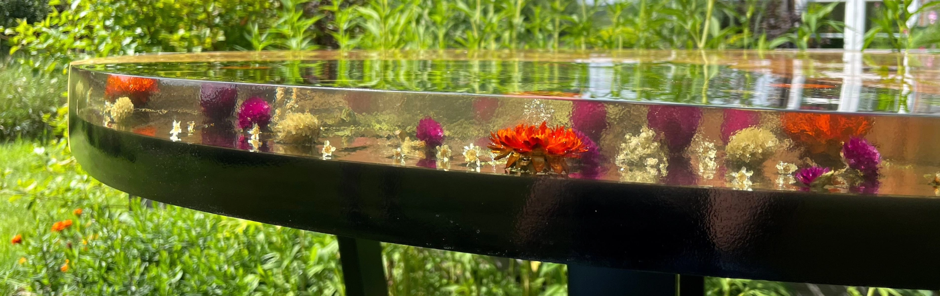 Stół jadalniany wykonany z plastra topoli z dużym ubytkiem wypełnionym czarną i transparentną żywicą, w której zatopiona jest kwiatowo-leśna kompozycja