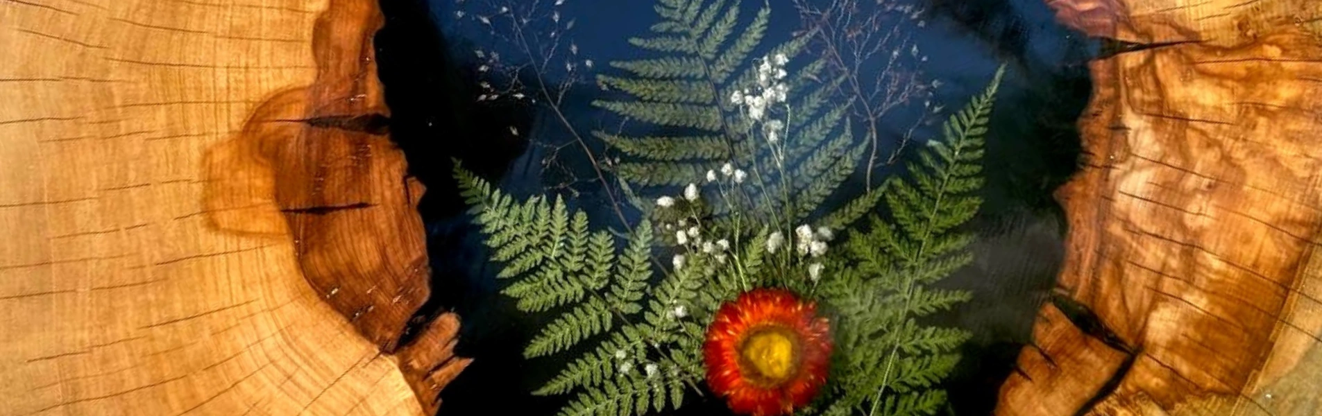 Stolik kawowy, który został wykonany z plastra drzewa kasztanowca w połączeniu z żywicą epoksydową, w której zalane są paprotki, suchotniki oraz gipsówka.