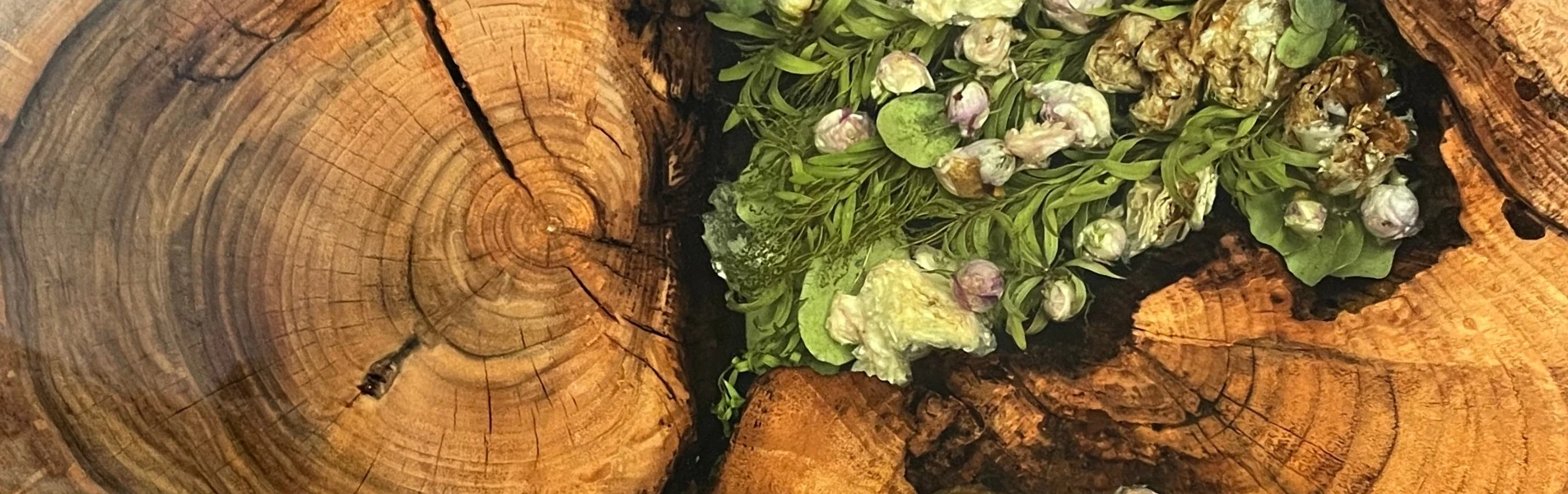 Stolik kawowy wykonany z plastra orzecha włoskiego w połączeniu z transparentną żywicą epoksydową, w której został zatopiony bukiet kwiatów ślubnych.