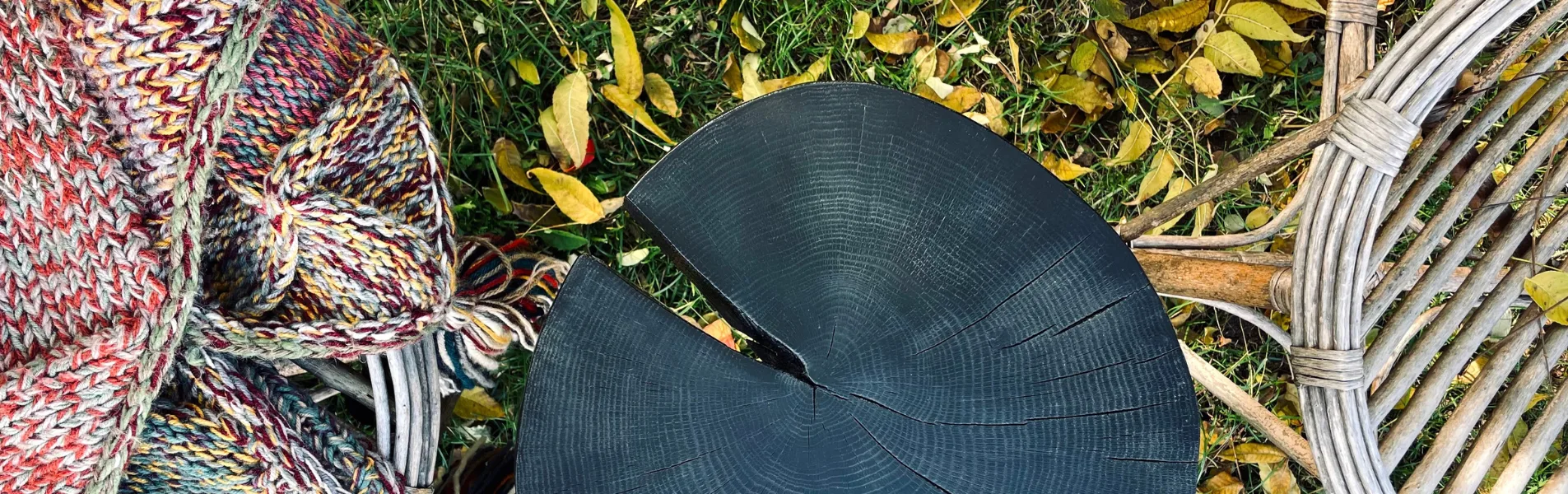 Okrągły stolik kawowy wykonany z plastra dębu, który został przypalony oraz zabezpieczony lakierem półmatowym - stoi na czarnych nogach wykonanych z prętów.
