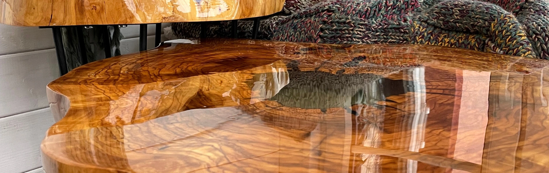 Komplet dwóch stolików kawowych wykonanych z plastrów drewna oliwnego wypełnionych bezbarwną żywicą epoksydową. Stoliki mają różne wysokości, żeby można było wsunąć jeden pod drugi