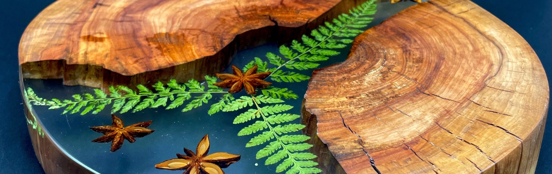 Piękny stolik kawowy z plastra jabłoni z motywem roślinnym zatopionym w żywicy.